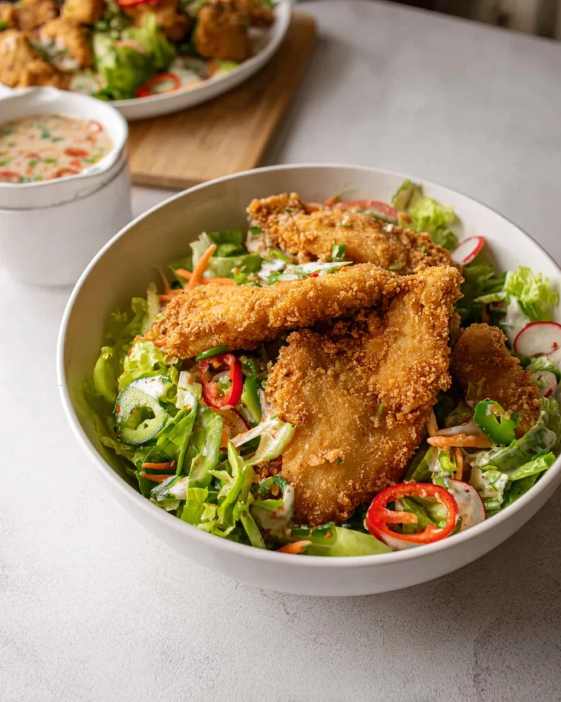 - Serve salad topped with crispy chicken and extra dressing on the side.